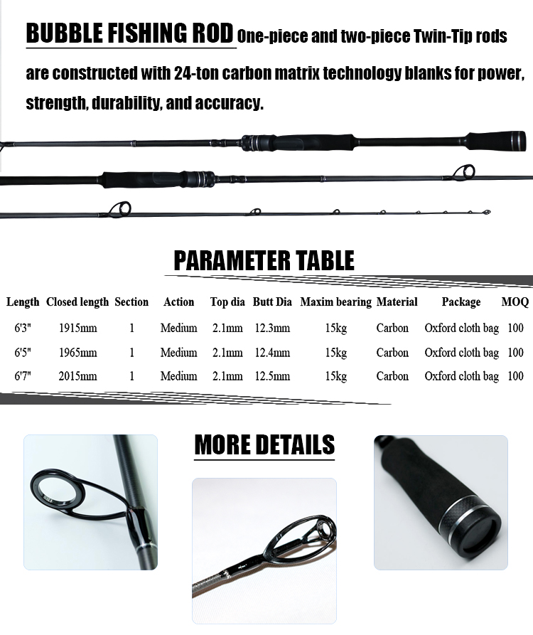 1.BUBBLE FISHING ROD One-piece and two-piece Twin-Tip rods are constructed with 24-ton carbon matrix technology blanks for power,strength, durability, and accuracy.